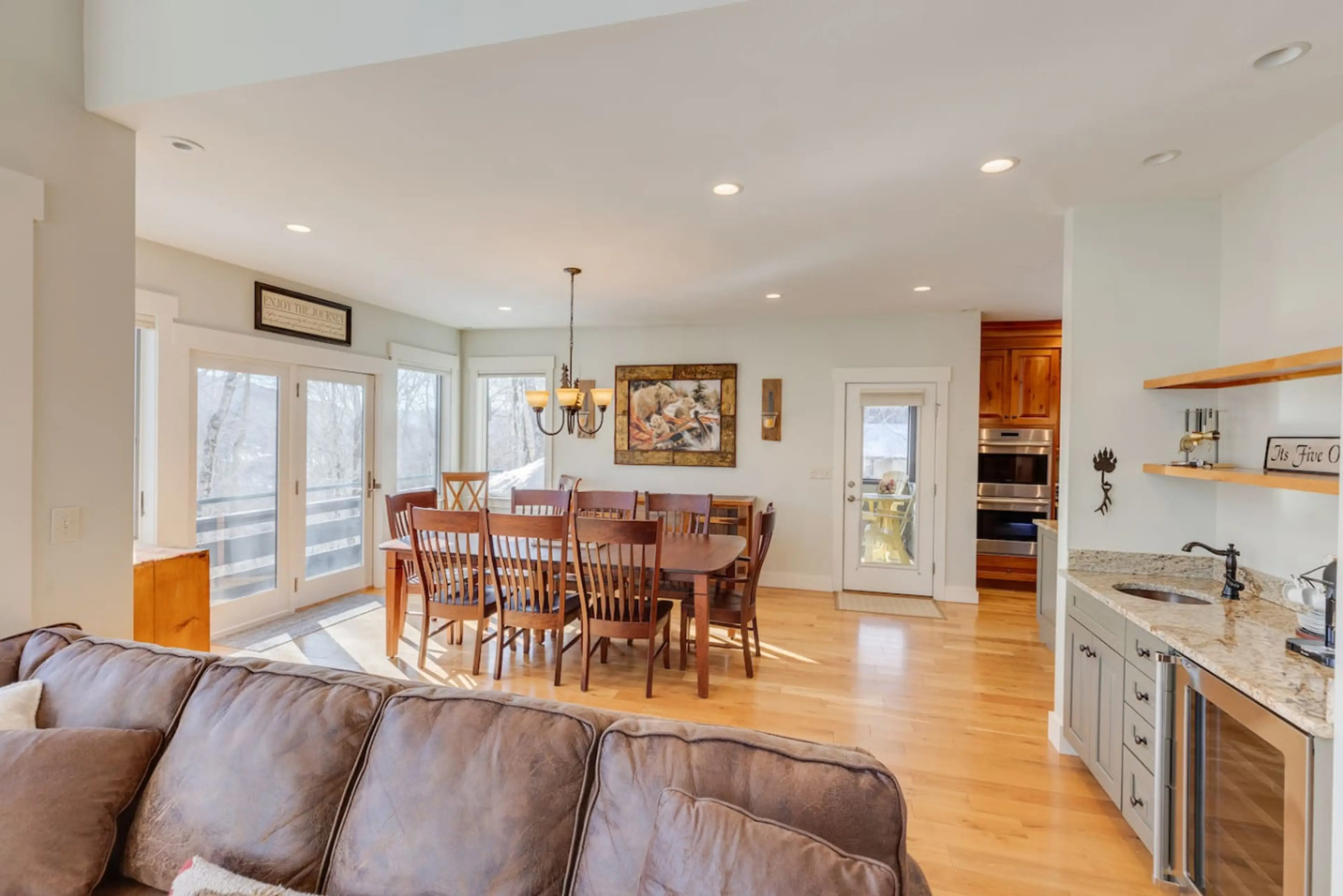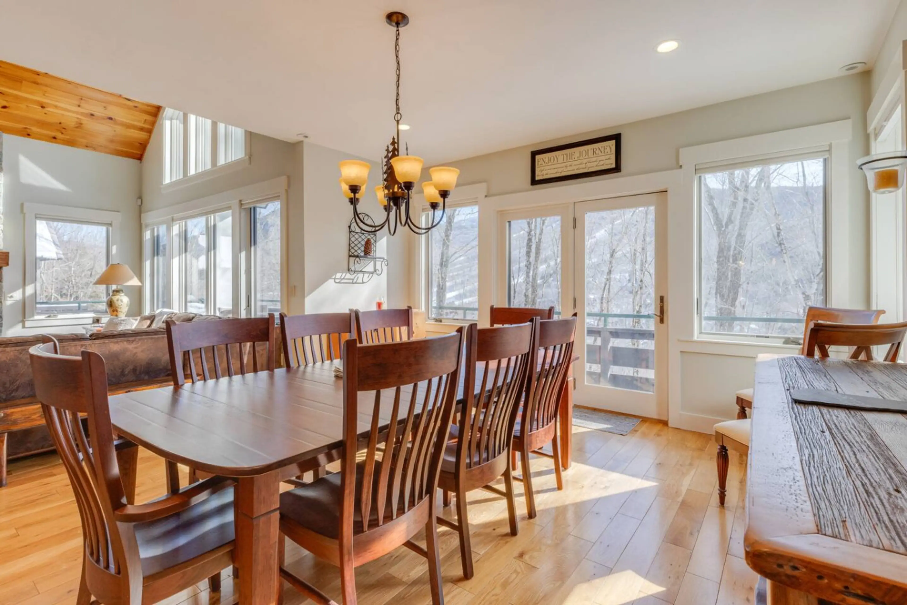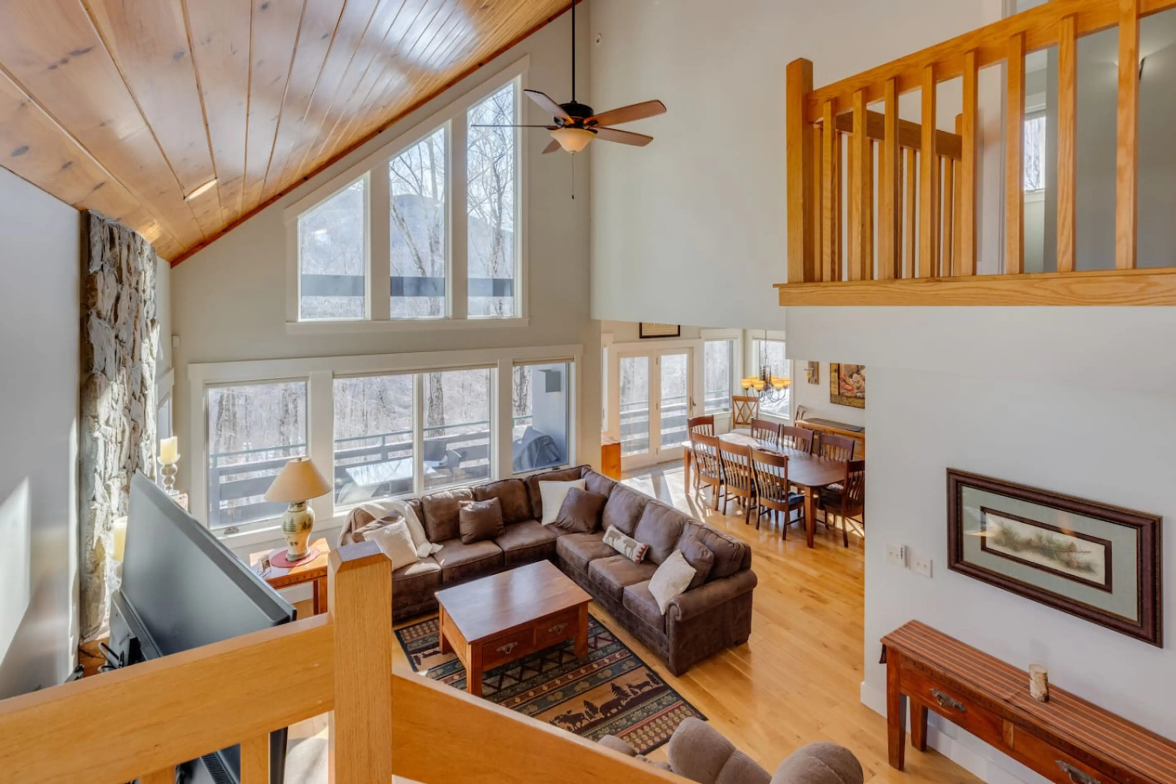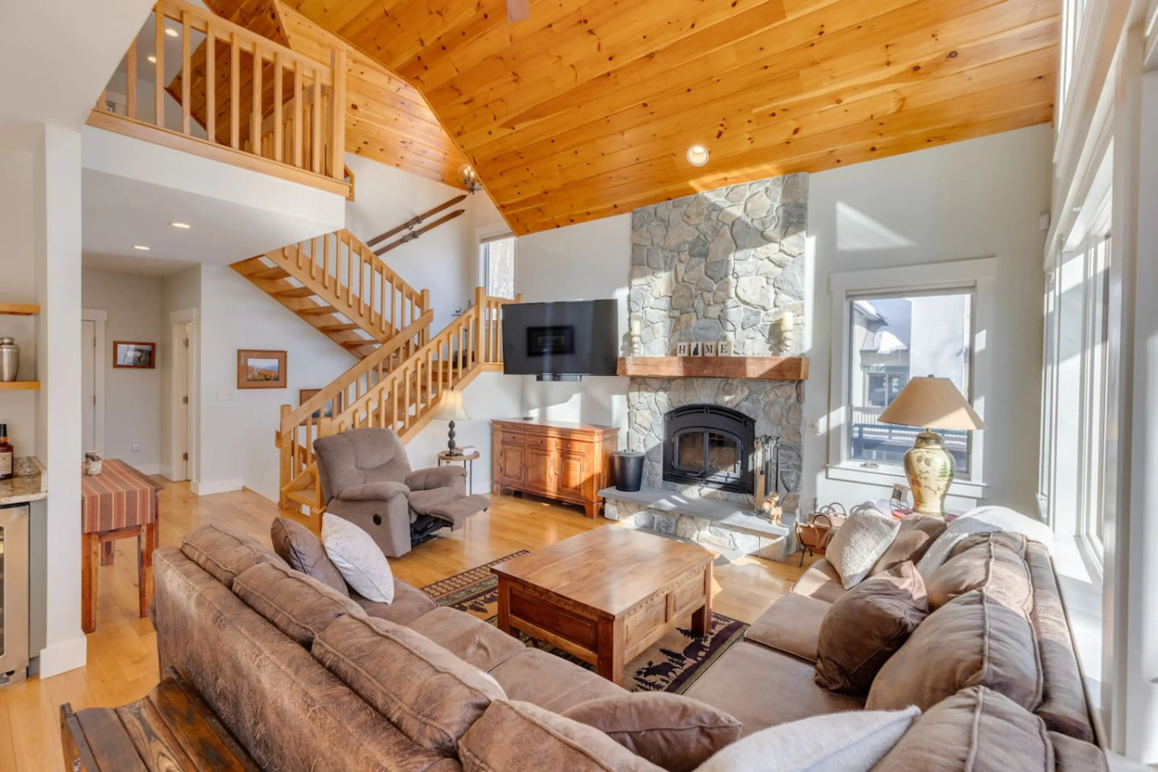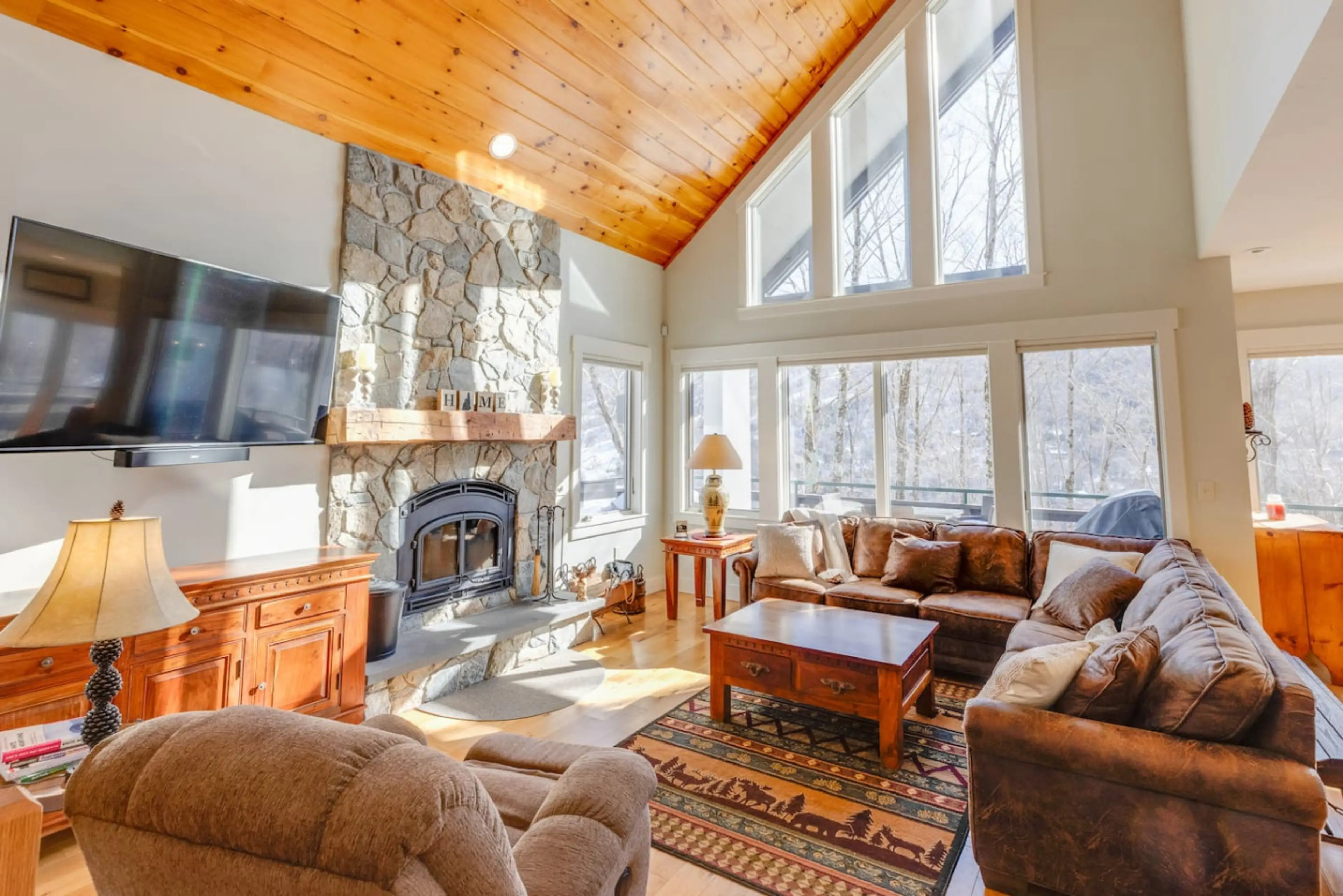 Welcome to the Flume House- this sprawling 5 bedroom, 5 bath home is spread over 5000 sq ft and 4 levels, offering space for 16 guests to enjoy comfortably. Stunning views of Loon's North Peak from almost every window. Highlights include a private 8 person hot tub with privacy walls, a home theater ...